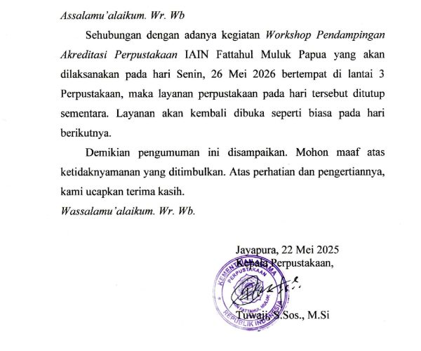 (iainfmpapua.ac.id) – Dalam upaya meningkatkan kualitas perpustakaan sebagai bagian penting dari proses akreditasi institusi, Perpustakaan IAIN Fattahul Muluk Papua menyelenggarakan Workshop Pendampingan Perpustakaan di aula perpustakaan, Senin 26 Mei 2025. Wakil Rektor I IAIN Fattahul Muluk Papua, Dr. H. Talabudin Umkabu, M.Pd, dalam sambutannya menekankan pentingnya peran perpustakaan dalam menunjang mutu institusi pendidikan tinggi. Ia […]
